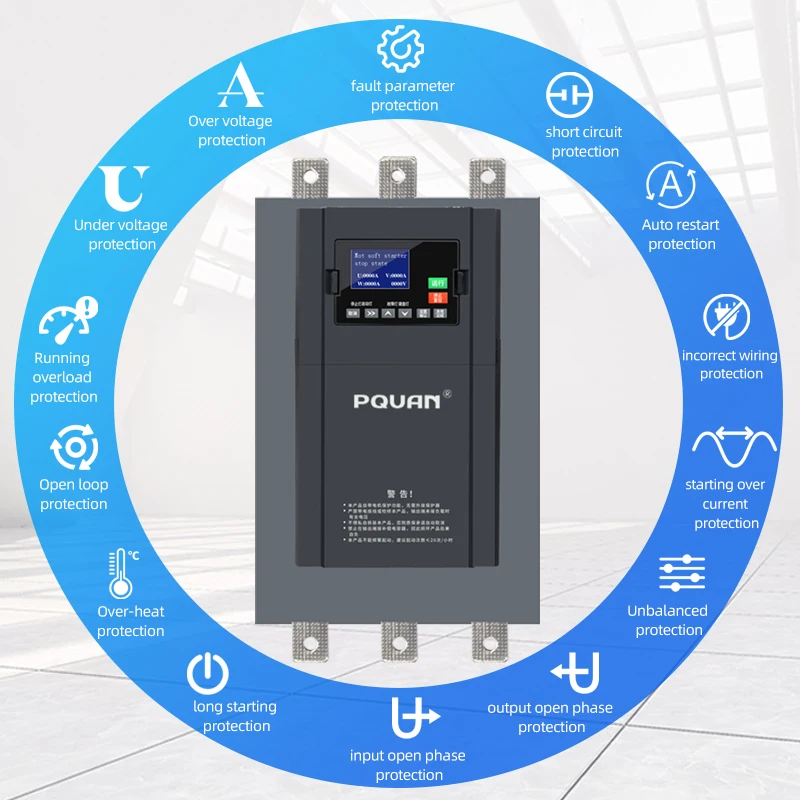 • Versatile Starting Modes: Current limiting start,Voltage ramp start,Kick start + current-limiting start, Kick start + voltage ramp start, Current ramp start, Voltage current-limiting double closed-loop start
